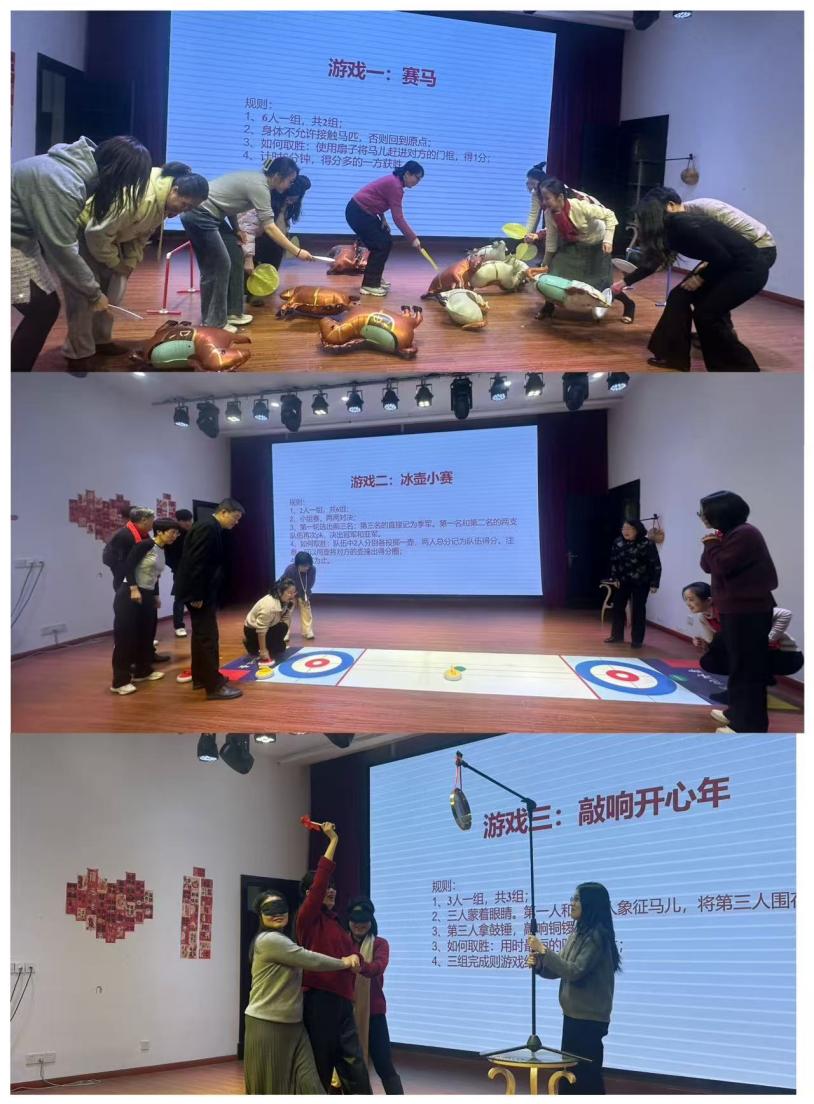 赛马、冰壶比赛、敲响开心年等游戏互动环节既新奇又妙趣横生,老师们踊跃参与,在欢声笑语中拉近距离,体验归属感,形成凝聚力。在文艺表演和游戏中间还安排了激动人心的幸运观众抽奖活动。蔡校长、刘院长抽取了三名幸运观众一等奖。韩戈玲、张乐副院长、沈莲莲副书记抽取了九名幸运观众二等奖。工会主席高文成、党政办主任郑元丰抽取了十八名幸运观众三等奖。激动人心的抽奖环节则将联欢活动再一下推向高潮,抽中教师惊喜连连,幸运教师收获惊喜礼品,全场掌声与欢呼声此起彼伏。联欢活动在喜气祥和、温情洋溢的氛围中圆满落幕。